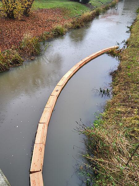 Der schwierigste Teil der Aktion ist es dabei, sie unter der Brücke hindurch zu befördern. Ein einzelnes, mit einer Schnur versehenes Element wird hierzu in den Fluss geworfen, damit es mit der Strömung der restlichen Berme entgegentreibt, mit ihr verbunden wird und das Ganze alsdann mit der Schnur unter der Brücke entlang gezogen werden kann. Dabei kam Hans Heinrich Krüger nicht umhin, in Wathosen in die Hunte zu steigen und die Berme heranzuziehen. Sodann konnte sie an beiden Seiten der Brücke befestigt werden.