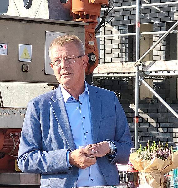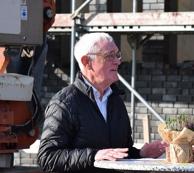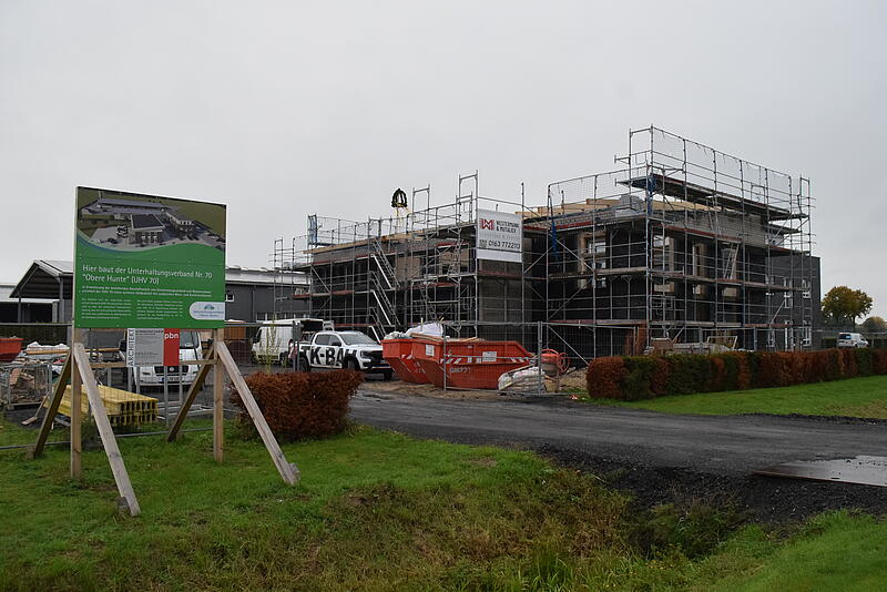 Bad Essen-Rabber. Stein auf Stein, das Häuschen wird bald fertig sein… - Die Steine sitzen, der Begriff „Häuschen“ wäre als Bezeichnung für den Erweiterungsbau des Unterhaltungsverbandes Nr. 70 „Obere Hunte“ (UHV 70) allerdings untertrieben, wird er doch auf 595 Quadratmetern Platz für neue Büros und Konferenzräume bieten. Am vergangenen Donnerstag konnte Richtfest gefeiert werden. Bei herrlichem Sonnenschein kamen dazu Geschäftsführer, Vorstände und weitere Gremienmitglieder sowie die Mitarbeiter von UHV 70 und Wasserverband Wittlage, der als Mieter fungiert, Nachbarn, Architekten und natürlich all jene, die bisher schon tatkräftig am Entstehen des „Häuschens“ mitgewirkt haben, auf der Baustelle zusammen.