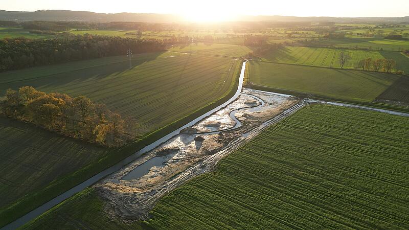 Durch die starken Niederschläge im Oktober ist hier – begrenzt von den im Rahmen der Renaturierungsmaßnahmen angelegten Böschungen und Gewässerrandstreifen – vorübergehend ein Becken entstanden, in dem sich gut nachvollziehen lässt, wie das Flüsschen sich beidseits des eingebrachten Strömungslenkers seinen Weg sucht.