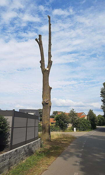 So wurden vorerst nur die äußeren bruchgefährdeten Äste entfernt, ein Torso aus Stamm und zwei Hauptästen blieb stehen. Der eine davon enthält die besagte Spechthöhle, der andere wird für dessen Bergung im Herbst benötigt.
