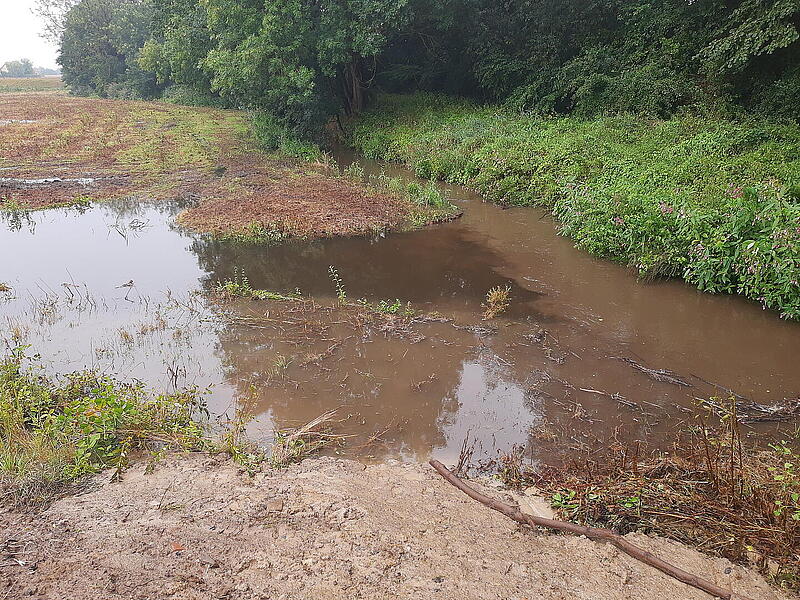 Beide Elemente dienen der Retention: Zum einen wird der unerwünschte Nährstoffeintrag von den Feldern am Hunte-Oberlauf durch die verlangsamte Strömung eher zurückgehalten, zum anderen besitzt die Sekundäraue bei Starkregen eine erhebliche Pufferwirkung, wie sich gerade dieser Tage gut erkennen lässt.