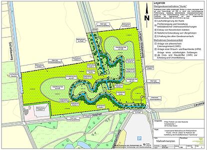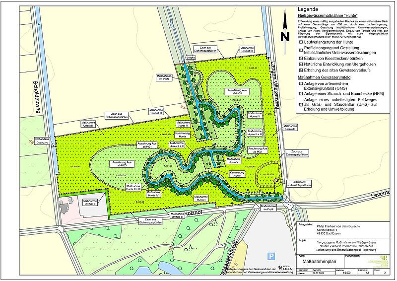 Im ersten Schritt wird derzeit der Splitt abgefahren, mit dem die Fahrwege auf den Parkflächen befestigt waren. Nach erfolgter wasserbehördlicher Genehmigung durch den Landkreis Osnabrück werden in weiteren Schritten umfangreiche Erdarbeiten und gewässerbauliche Maßnahmen erfolgen, die der Hunte ihren ursprünglichen mäandrierenden Verlauf zurückgeben. Es werden natürliche Uferbereiche mit Totholz, Kies und heimischen Gehölzen angelegt sowie im weiteren Bereich Hecken und Wiesen, auf denen zukünftig ganzjährig Galloway- oder Schottische Hochlandrinder weiden sollen. Um die Gesamtfläche soll ein Spazierweg führen.
