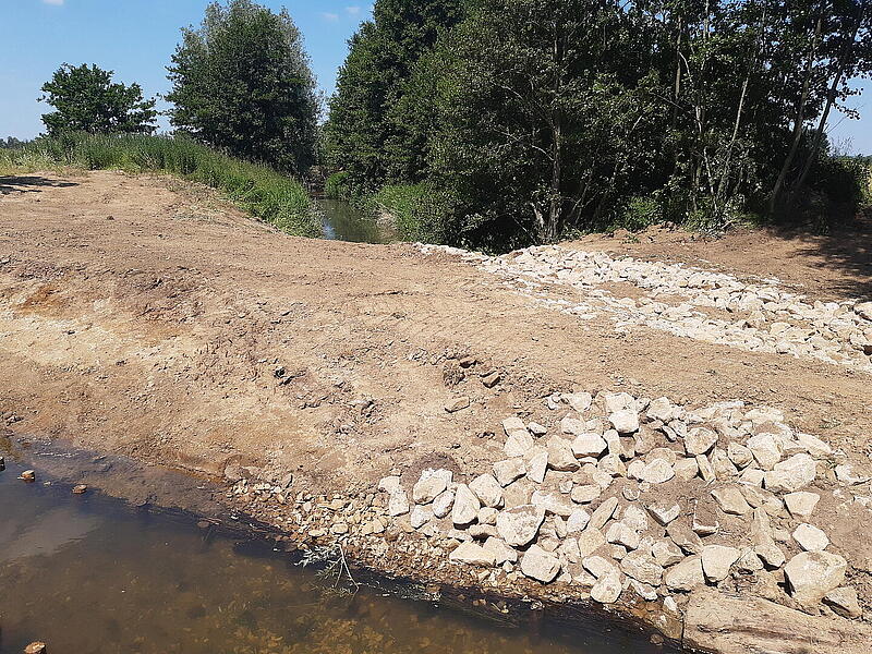 Noch sieht man die neu geschaffenen Kiesbänke und die Befestigungen aus Holzpfählen und Totholz. Doch schon bald werden Pflanzen und Tiere das Areal beleben. Durch die Renaturierung wird sich der Lauf der Hunte um 250 Meter verlängern und eine Aue entstehen. Dies ist Artenschutz für Tier- und Pflanzenwelt und Hochwasserschutz für die Ortschaft.